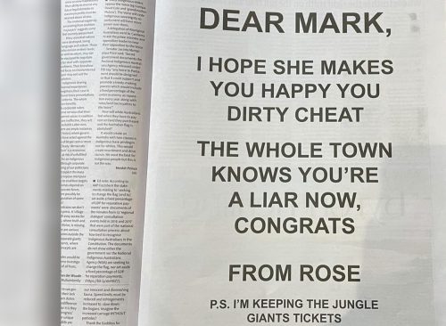 In the full-page ad that was published in the Byron Shire Echo newspaper, Rose called out her husband Mark for being a “liar” and “cheater.” “Dear Mark, I hope she makes you happy you dirty cheat. The whole town knows you’re a liar now. Congrats. from Rose. P.S. I’m keeping the Jungle Giants tickets.”